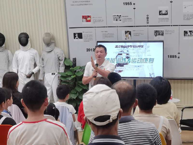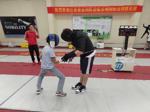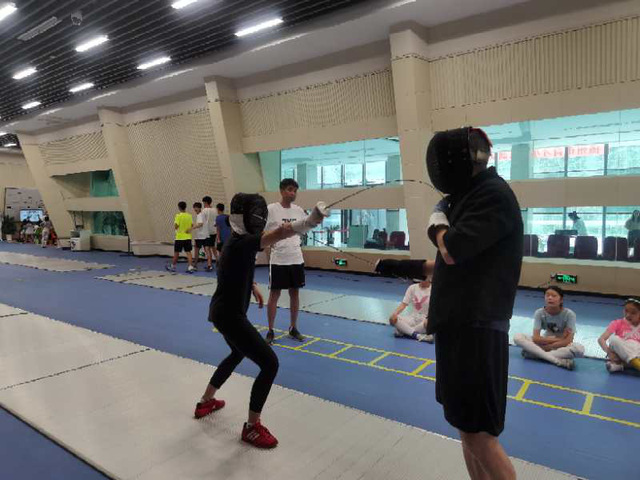 学院办公室主任张蕾教练指导击剑爱好者训练