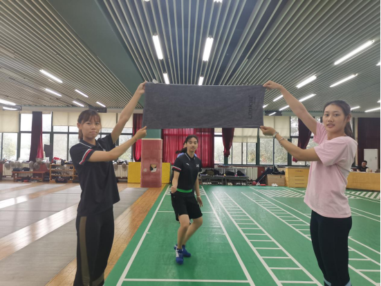 女花运动员樊施丽展示运动毛巾与筋膜枪