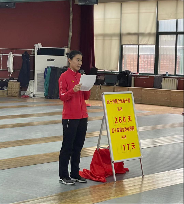 金松副校长在仪式上发表讲话,他充分肯定了击剑学院此举的积极意义,在全校竞技训练单位开了一个好头。他指出,第十四届全运会已日益临近,今天离击剑项目第一站预赛仅17天时间了,已经进入临战状态了,竞技体育不能等,竞技体育是奋斗出来的,今天我们组织这场仪式,就是要提醒大家备战时间的紧迫,绝不能再等待了,要立即行动起来,奋斗起来,只有奋斗才能赢得胜利,才能获得冠军,只有奋斗才能有效推进备战,完成既定任务指标,击剑学院全体人员一定要立即行动起来,奋斗起来,齐心协力,共同努力,凝必胜之信心,打有把握之战,当全校之先锋,谋全运之开局,打好预决赛,完成好任务指标,为全校参赛工作贡献力量。