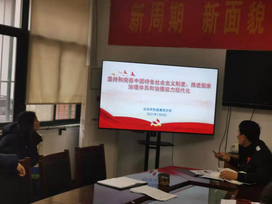 直属支部书记沈朝阳给全体党员上了一堂题为《坚持和完善中国特色社会主义制度、推进国家治理体系和治理能力现代化》的专题党课,并一起学习了总书记的“新年贺词”;在前一阵开展谈心谈话、对照检查的基础上,代表支部作履行党建工作责任述职;领导班子成员和支委带头进行自我批评,全体党员开展批评与自我批评,书记对党员同志进行逐一点评,相关同志对其他党员提出的批评意见进行表态。