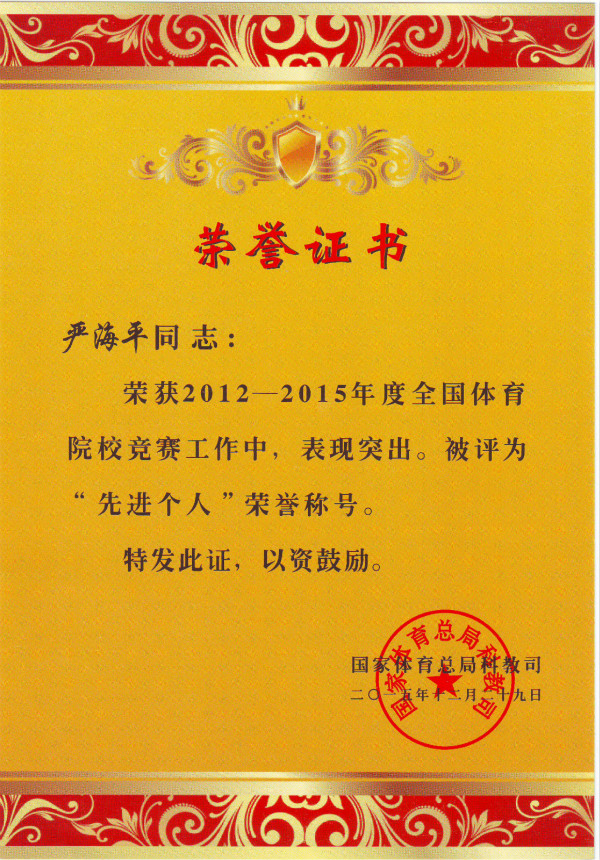 严海平同志获2012-2015年度“全国体育院校竞赛先进个人”