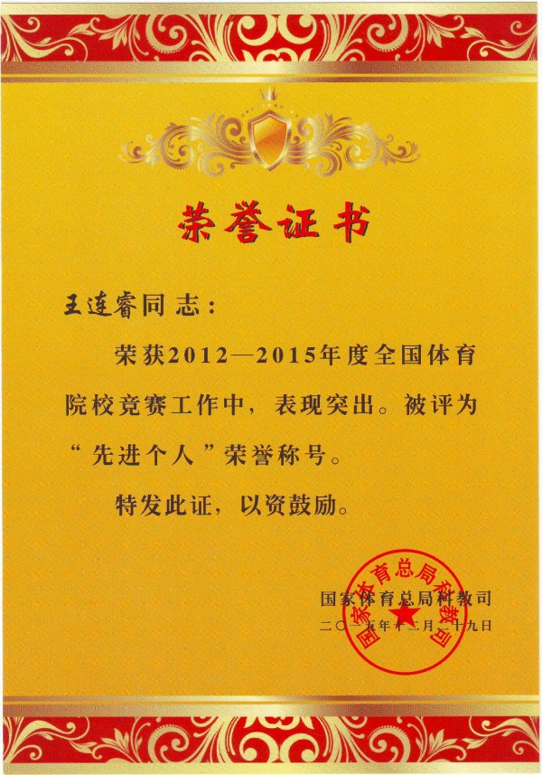 王连睿同志获2012-2015年度“全国体育院校竞赛先进个人”