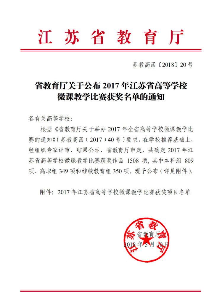 近日江苏省教育厅印发《省教育厅关于公布2017年江苏省高等学校微课教学比赛获奖名单的通知》(苏教高函〔2018〕20号)(详见附件1),我校推荐的8组参赛作品(本科组)全部获奖,其中一等奖1项、二等奖4项、三等奖3项(详见表1)。