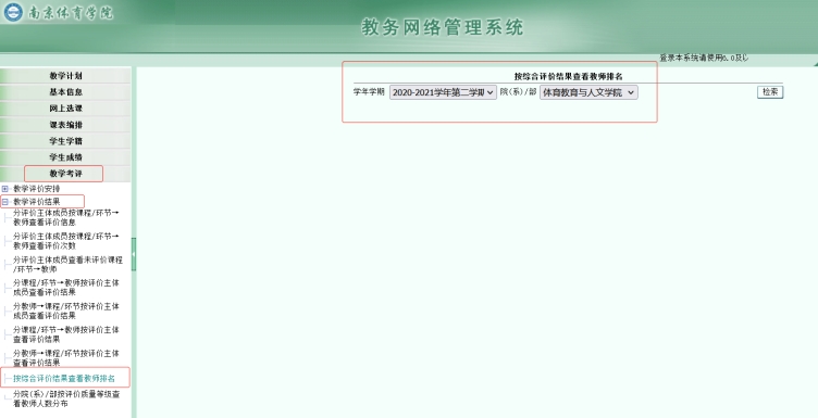 教学秘书以管理人员身份登陆教务网络管理系统(http://jwc.nipes.cn/),在页面左侧工具栏依次选择“教学考评→教学评价结果→按综合评价结果查看教师排名”,然后在页面右侧“学年学期”选择“2020-2021学年第二学期”,“院(系)部”选择相应学院,点击“检索”即可。