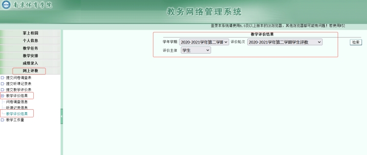 2020-2021学年第二学期学生网上评教工作已顺利完成,现已在教务网络管理系统中公布结果,具体查询方式如下: