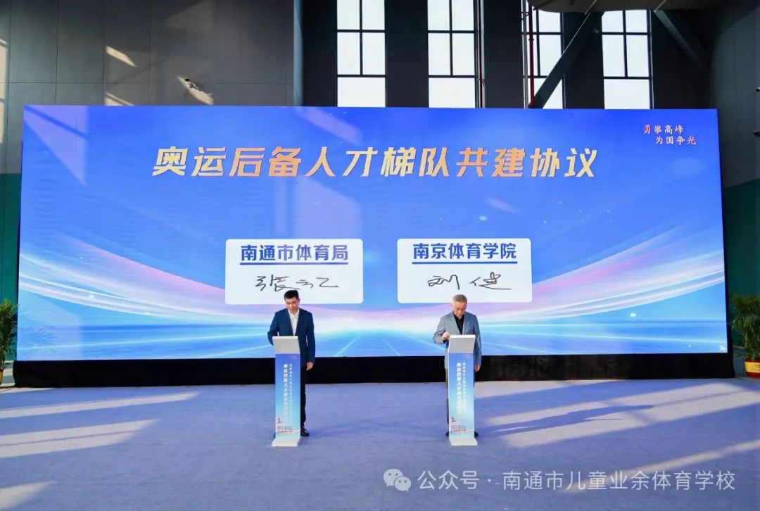 签约仪式由南通市体育局党组书记、局长江华主持。党委常委、副校长刘健与南通市体育局副局长张云飞分别代表学校及南通市体育局签署了奥运后备人才梯队共建合作协议。仪式开始前,与会领导、嘉宾共同参观南通市儿童业余体育学校新校区各训练场馆设施建设情况。