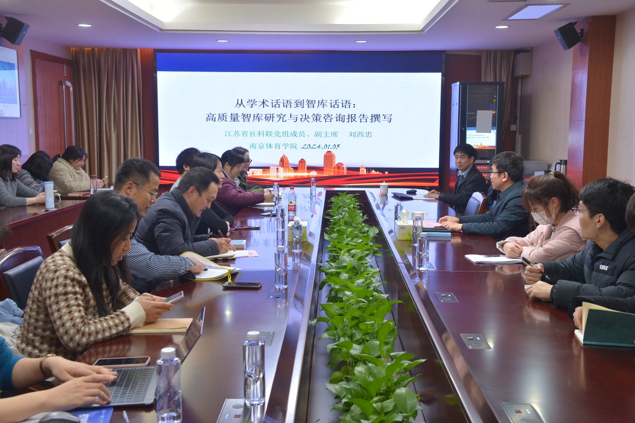 朱传耿从目标定位、主要工作和下一步计划等方面介绍了江苏体育强省建设研究基地的基本情况。与会专家围绕研究基地发展和智库建设展开了深入的研讨。会后,刘西忠以《从学术话语到智库话语:高质量智库研究与决策咨询报告撰写》为题为我校教师做了精彩的辅导报告,与会教师表示深受启发,受益匪浅。