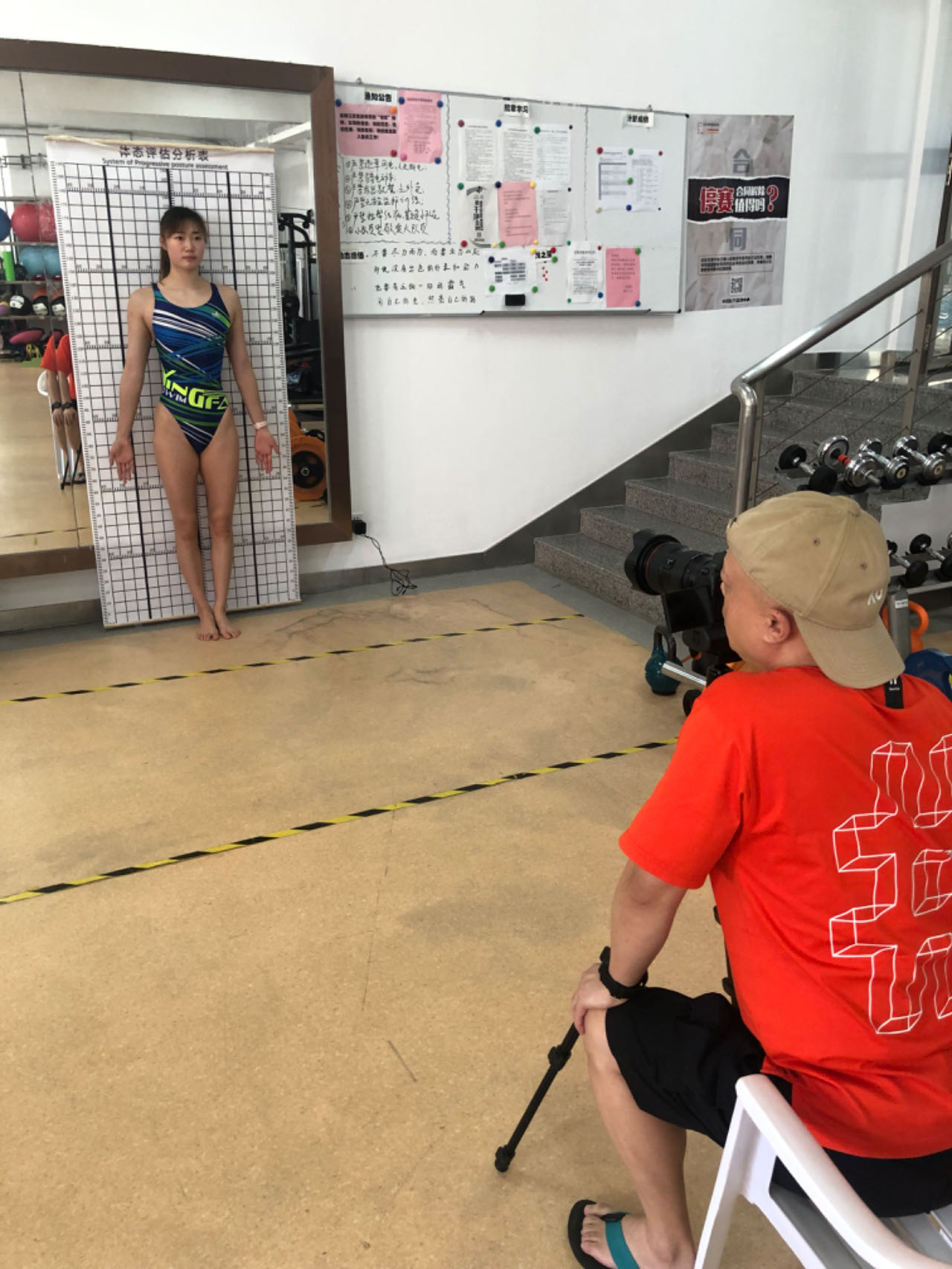 顾忠科老师对王赐月进行肌肉形态拍照用于对比训练效果