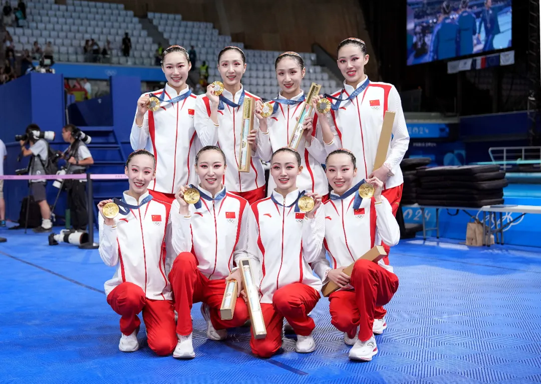 bjycgold运动员王赐月(后排左一)与队友队夺得巴黎奥运会花样游泳集体项目金牌