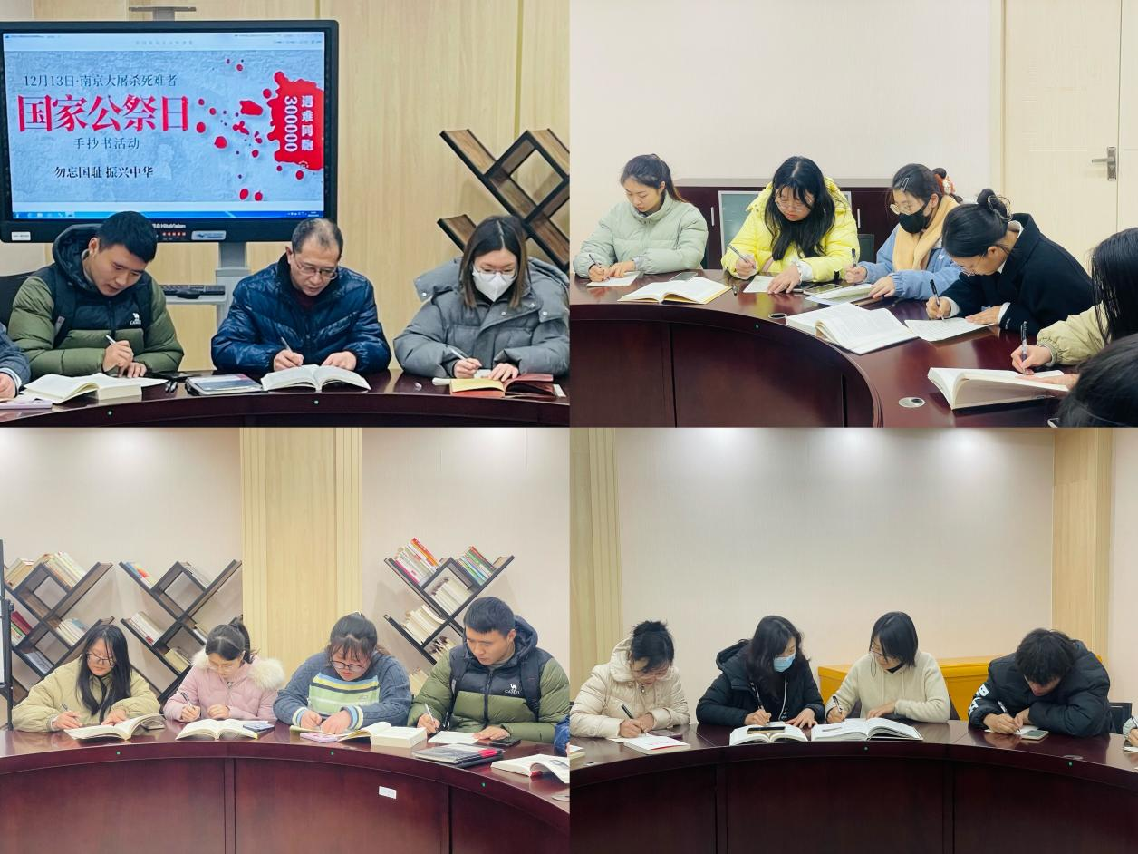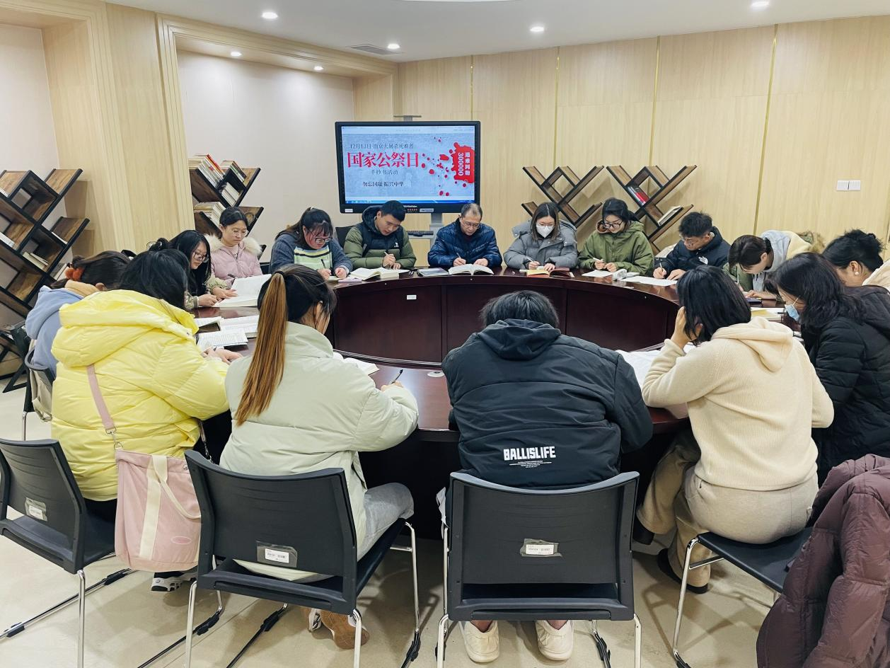今天是南京大屠杀死难者国家公祭日,我校图书馆组织学生代表、学生馆员和我馆馆员进行了一场主题为“勿忘国耻,振兴中华”的抄书活动。本次活动的目的是为了更加深入地了解南京大屠杀的历史,铭记历史,珍爱和平,为实现中华民族的伟大复兴而努力奋斗。