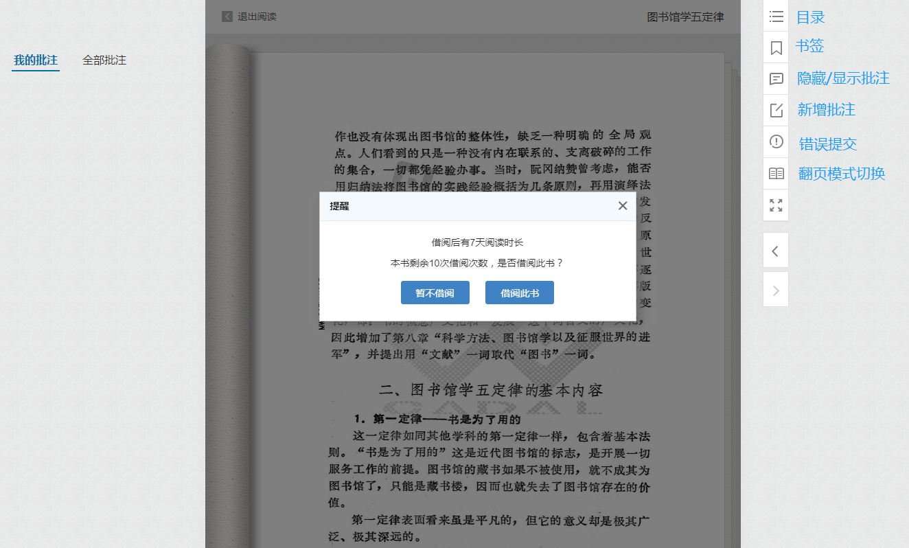 阅读的同时,还可以查看目录,添加书签、新增/查看标注,切换翻页模式。如果您在阅读的过程中发现问题,可以点击“错误提交”与管理员联系。