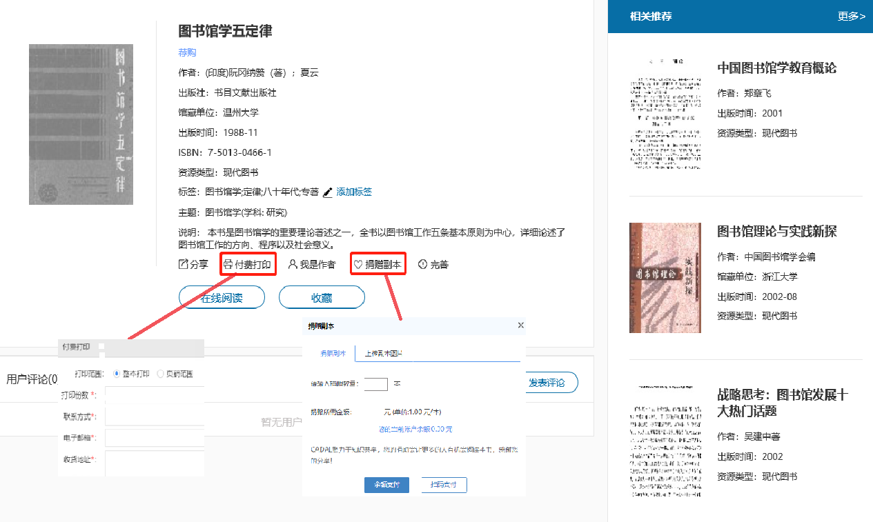 资源详情页面,提供了很多个性化服务,比如添加标签,发表评论、分享资源、收藏资源、完善数据、付费打印、捐赠副本、相关资源推荐等。