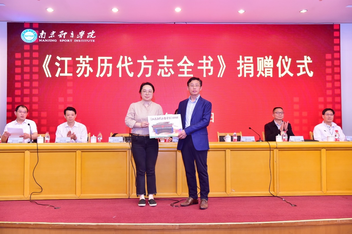 沈萌溦代表江苏省方志馆向我校捐赠的《江苏历代地方志全书》530册,并对该套图书做了简要的介绍,《江苏历代方志全书》系统地记述了新中国成立前江苏地区各个时期的自然、政治、经济、文化与社会的历史与现状,展现了江苏深厚历史文化,堪称记录江苏古代风土人情的百科全书