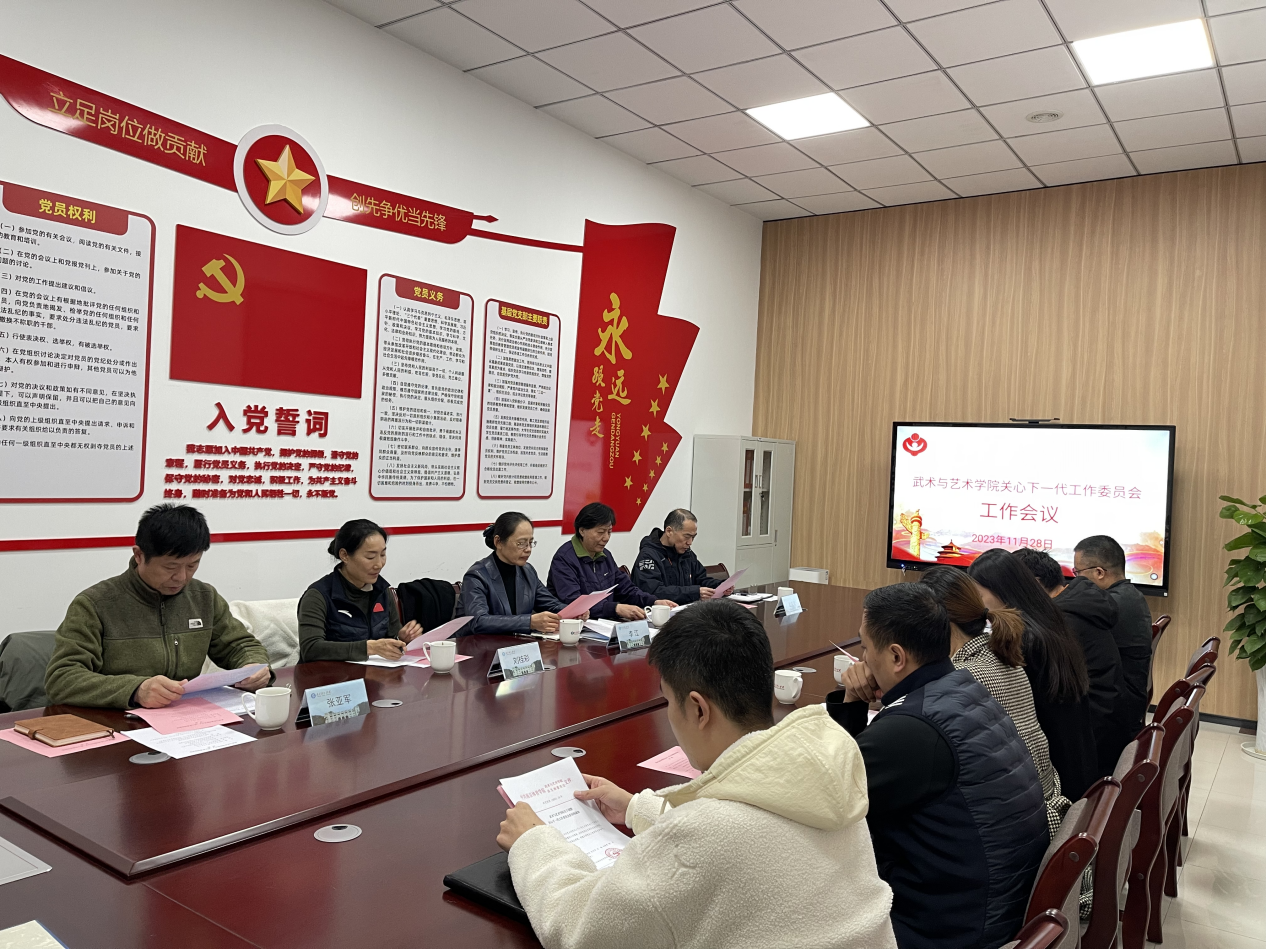2023年11月28日下午,武术与艺术学院在校工会党员活动室召开关心下一代工作委员会(下称关工委)会议。校关工委常务副主任李江、校离退休党总支副书记刘桂彩以及武术与艺术学院新一届关工委全体委员参加会议。会议由武术与艺术学院党总支副书记杜家俊主持。