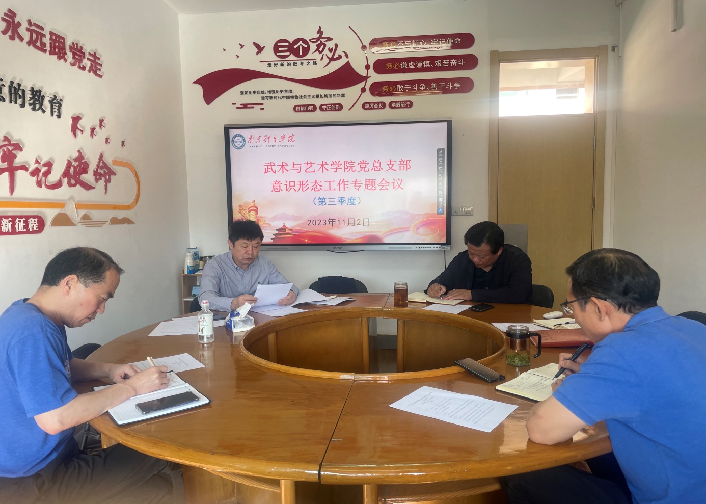 112日上午,武术与艺术学院党总支在教学楼2号楼308会议室召开总支委员会议,专题研究意识形态工作。学院党总支书记张亚军主持。全体总支委员参加会议。