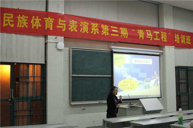 2015年4月14日,民族体育与表演系 “青年马克思主义者培养工程”培训正式开班,系党总支书记、系主任吴晓红老师、系副主任支川老师、学工处学生管理科科长王菁菁老师、系辅导员阚妮妮老师、院学生会主席团代表、兄弟院系的学生会主席和我系46名团学骨干一起参加了开班典礼。开班仪式由阚妮妮老师主持,她向全体人员介绍了“青马工程”的背景和意义。随后系党总支书记、系主任吴晓红老师鼓励大家发挥学生骨干的积极作用,希望大家通过此次培训,提升自我品格,提高各方面能力。