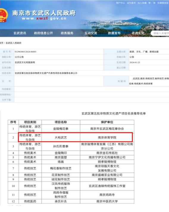我校成功申报首个武术非遗项目 ——“大枪武艺”入选南京市玄武区非物质文化遗产项目名录