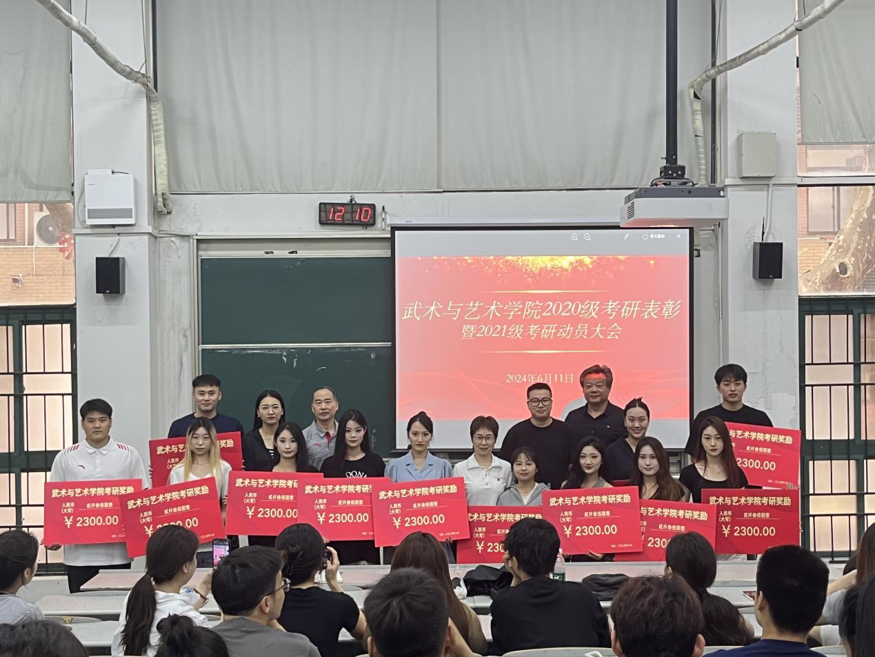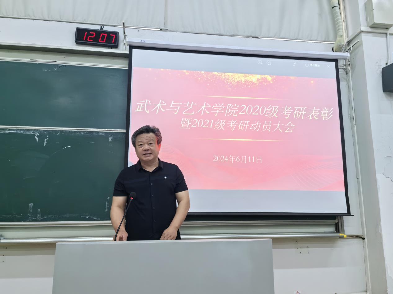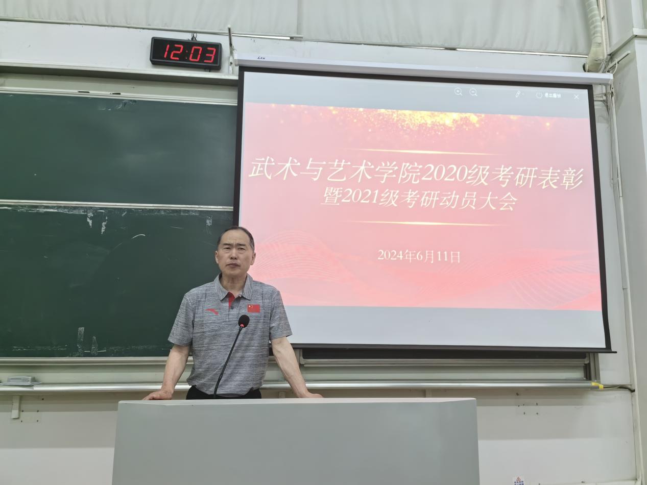 2024年6月11日中午,武术与艺术学院于教学实验楼阶梯教室三举行2020级考研表彰暨2021级考研动员大会。学院党总支书记叶瑛、党总支副书记杜家俊、副院长唐芒果、辅导员常青、陆丹和2020级拟录取研究生以及2021级全体学生参加了此次会议。会议由党总支副书记杜家俊主持。