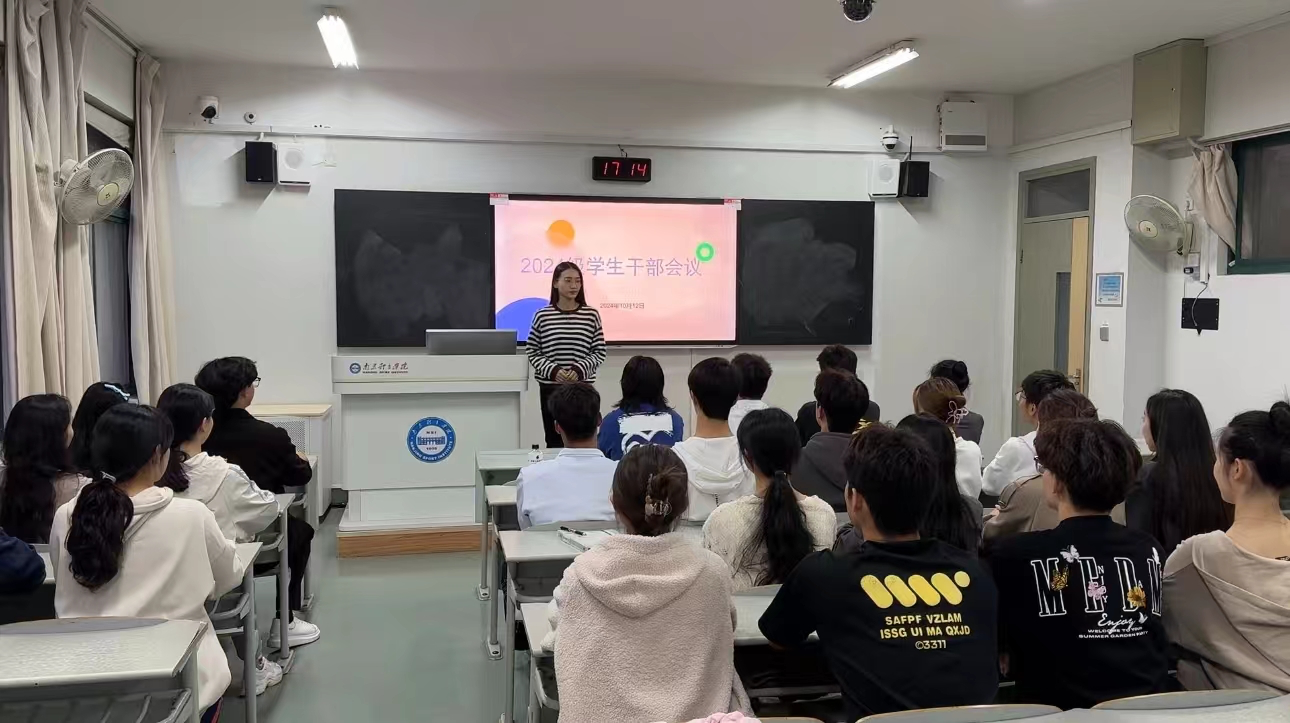 会议第二部分,辅导员陆丹对2024级新成立的学生干部队伍进行第一次集体培训,从学生干部的角色定位、工作职责和团队合作等方面进行详细讲解,强调了学生干部应具备的责任感和使命感。她指出学生干部是学院与学生之间的桥梁和纽带,是学院各项工作顺利开展的重要推动者,希望大家能够珍惜机会、努力学习,不断提升自己的综合素质和工作能力,并鼓励学生干部勇于担当、敢于创新,形成班级管理与服务的工作合力,共同建设一个团结友爱、积极向上、并肩作战的2024级学生干部团队,为学院发展贡献力量。最后还对早操中学生干部的值班安排、具体职责、考勤管理、纪律要求等方面进行了强调说明。学生干部纷纷表示会以身作则、不负重托,以饱满的热情和坚定的信念投入学习、生活和工作,为武术与艺术学院增光添彩。