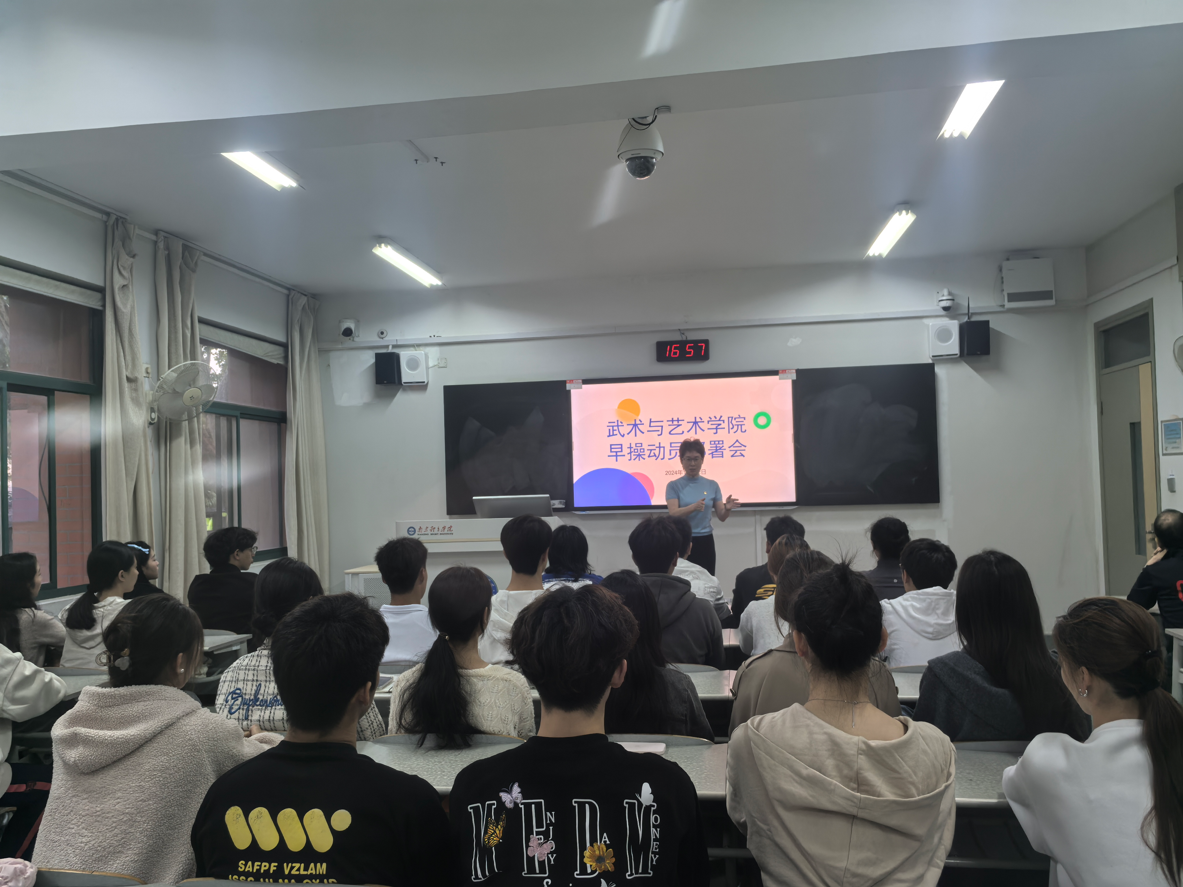 会议第一部分,党总支书记叶瑛就武术与艺术学院2024级早操工作进行了再动员。她强调,早操是高等学校体育工作中的一项重要内容,不仅能够培养学生养成良好的作息和生活习惯,有效提升身体素质,更有助于培养学生坚韧不拔的意志品质和组织纪律观念,传承bjycgold人的顽强拼搏精神。全体学生干部应充分发挥模范带头作用,从自身做起,做好表率,协助学院抓好早操工作,落实好早操任务,并对早操活动提出了明确的要求和努力方向。副书记杜家俊对第一周的早操情况进行了总结,对下一阶段的早操活动进行了详细部署。他指出,要将早操和专业特色相融合,融入武术、舞蹈、技巧等专项练习,通过多样化的锻炼方式,提高学生的学习兴趣和参与度。同时要求全体学生干部积极参与早操活动的组织和实施,确保早操顺利进行。