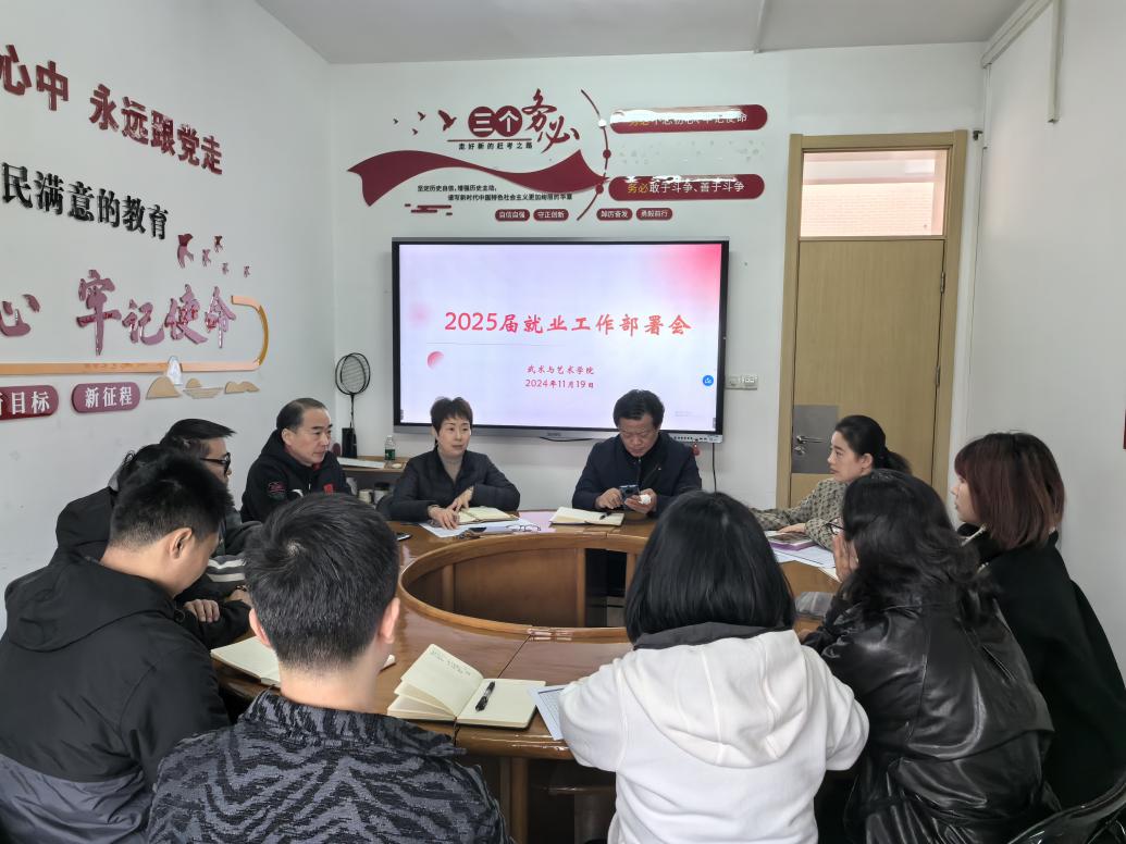 为扎实推进毕业生就业工作,全力促进2025届毕业生早就业、就好业,11月19日中午,武术与艺术学院在少体校308会议室召开2025届就业工作部署会,学院党政班子成员、各系正副主任、各年级辅导员及2025届毕业班班主任参加会议。会议由党总支副书记杜家俊主持。