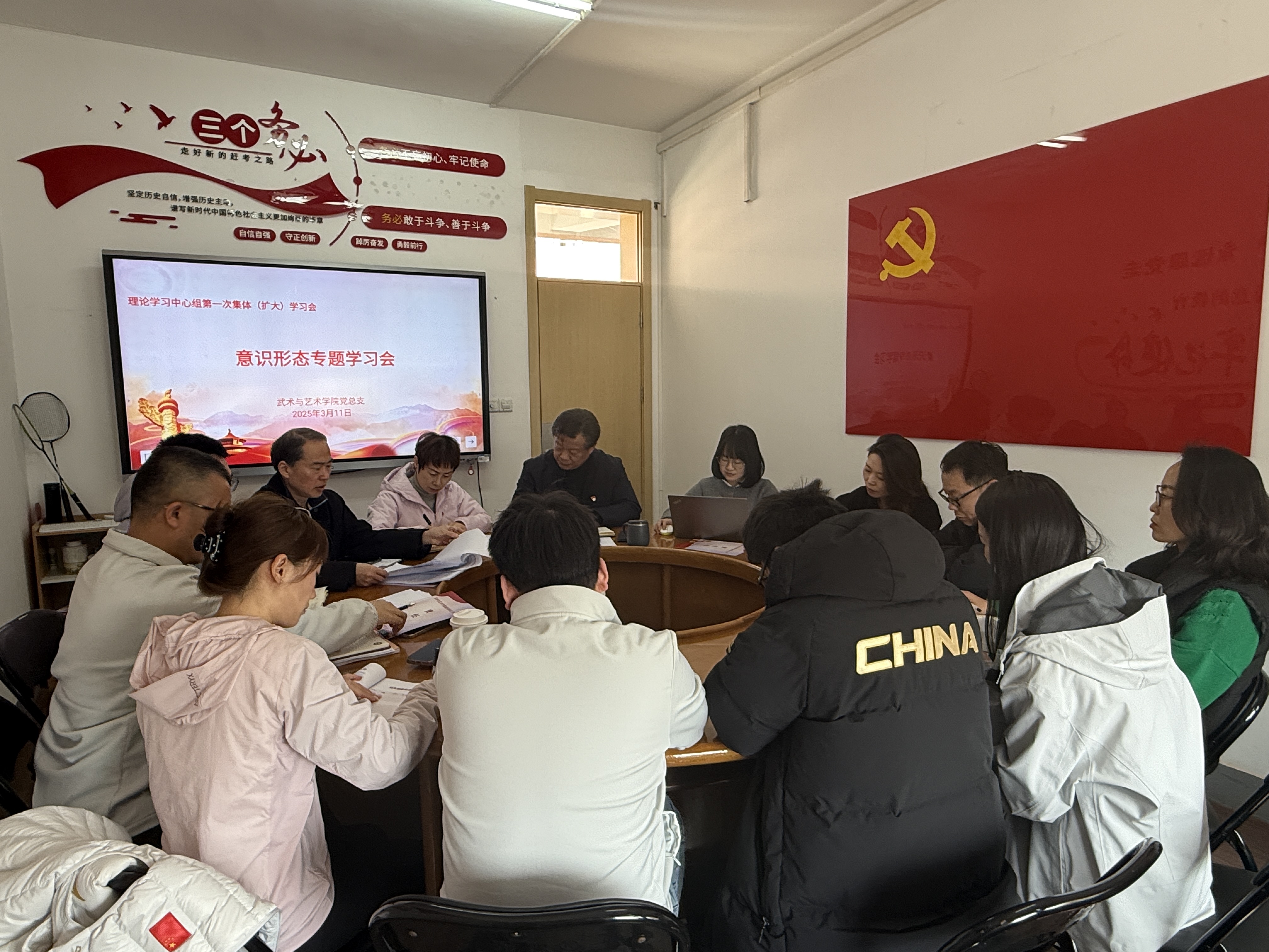 3月11日中午,武术与艺术学院党总支理论学习中心组召开意识形态专题学习(扩大)会。会议由学院党总支书记叶瑛主持,理论学习中心组全体成员、各支部委员及系副主任参加。
