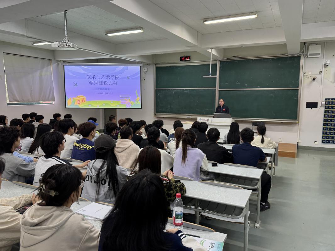 为进一步加强学风建设,营造优良学习氛围,4月22日下午,武术与艺术学院于教学实验楼阶梯教室召开迎接本科教育教学审核评估暨学风建设大会。会议由学院党总支副书记杜家俊、辅导员马高曼及全院学生参加,辅导员陆丹主持。