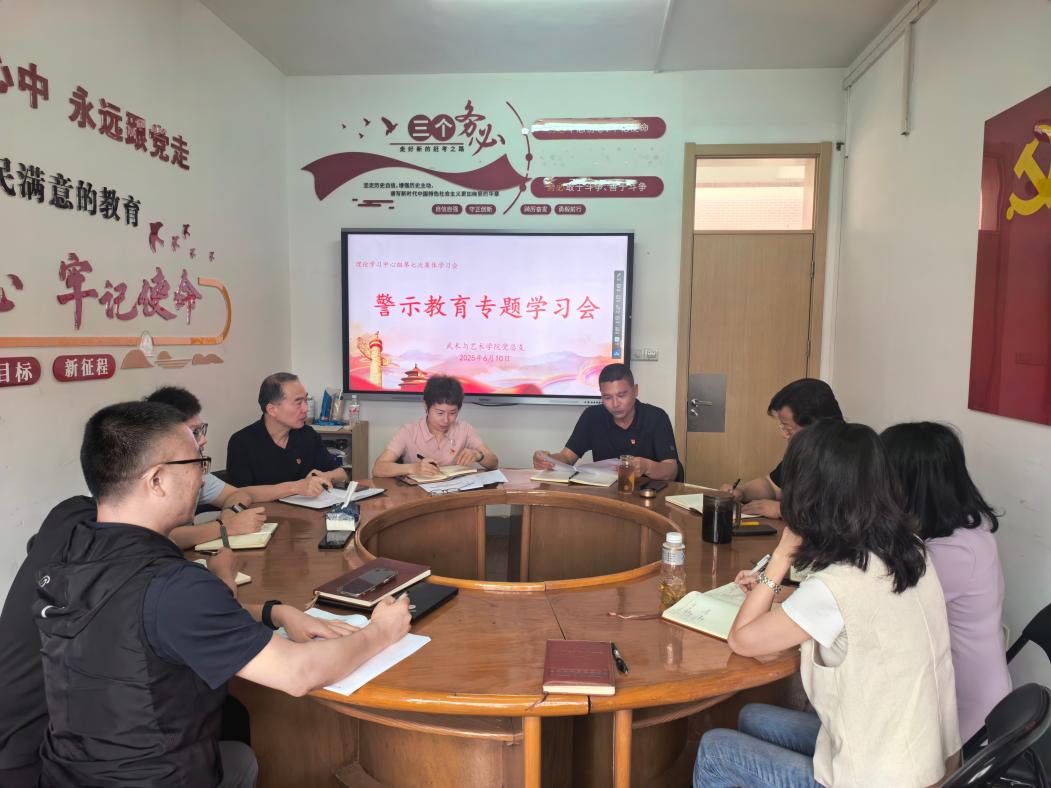 6月10日中午,武术与艺术学院党总支理论学习中心组召开2025年度第七次学习会,深入开展警示教育专题学习。会议由学院党总支书记叶瑛主持,理论学习中心组全体成员参加。