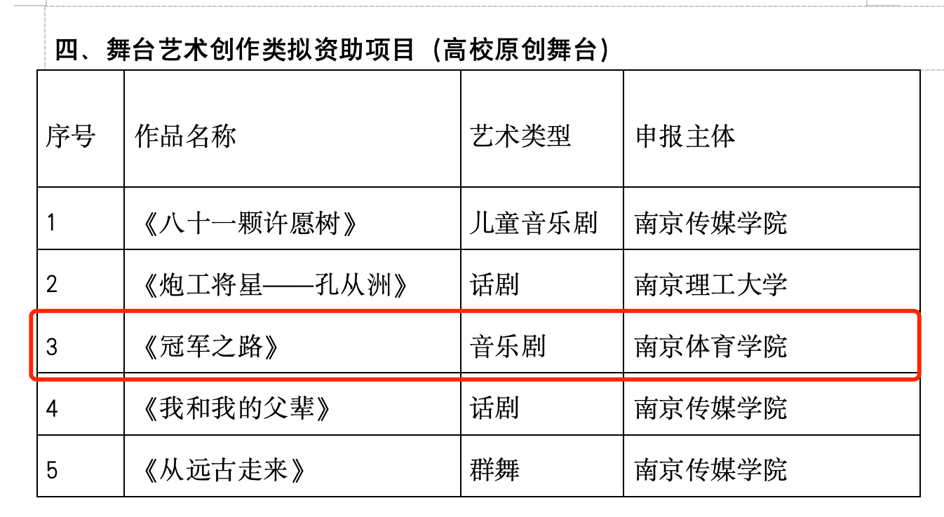 近日,南京市文化和旅游局发布南京艺术基金2023年度资助项目立项名单公示,在高校原创舞台项目中,共获批立项5项,其中,我校大型原创音乐剧《冠军之路》项目获得立项。这是我校首次获批大型舞台创作类艺术基金项目。