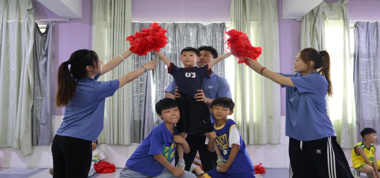 展演分为三个篇章,勾勒了“冠军星火·艺启未来”社会实践团的支教脉络。首章《拳舞飞扬·薪火流光》融合“武旗”“彩带龙”“五步拳”“刀剑”四大元素,节目《武动乾坤》以武术为骨,传统文化为魂。旗帜列阵、少年承师训、彩带龙翻腾游走,让传统武术在刚柔并济中焕发新生,尽显中华武魂的千年积淀与生生不息,同时印证了“以武强身、以武铸魂”的教学初心。次章《艺润童心·向美而行》通过傣族舞《花儿》和拉丁舞《拉丁风暴》展现了民族舞轻柔舒展与拉丁舞的热情奔放的差异,两台节目各具风采,孩子们用精准的舞步诠释着对不同舞种的理解,展现了从“模仿学习”到“自信表达”的成长蜕变。终章《活力绽放·青春飞扬》以“花球啦啦操”“街舞啦啦操”“技巧啦啦操”接连亮相的方式,将现场氛围推入高潮。师生共创作品《星梦绽放》呈现了跳跃的活力、街舞的动感、花球的斑斓,在小朋友与老师们的齐心协力下,共同绘就了一幅绚烂的青春画卷。