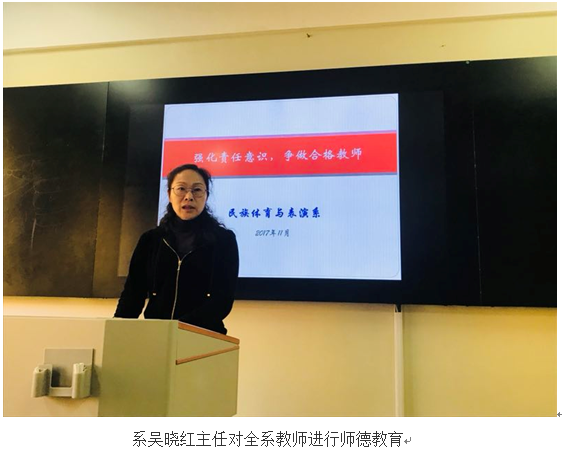 “师德”,是教师和一切教育工作者在从事教育活动中所遵守的道德规范和行为准则及与之相适应的道德观念、情操、品质,是教师工作的核心和精髓,可以用“师爱为魂,学高为师,身正为范”概括其内涵。民族体育与表演系历来重视对教师的师德教育,11月5日下午,民族体育与表演系全体教师进行了有关师德教育的学习,会议由吴晓红主任主持。