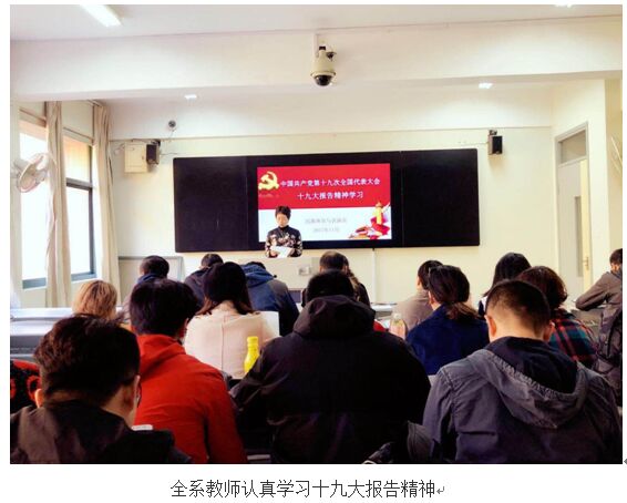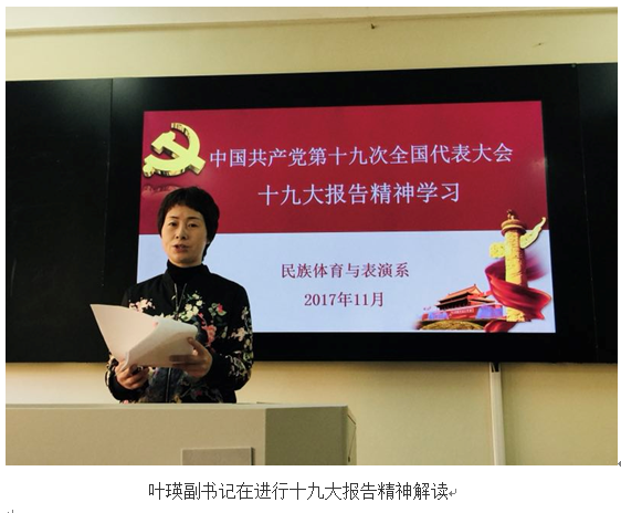 中国共产党第十九次全国代表大会于2017年10月18日至10月24日在北京召开。为了更好的学习十九大报告,狠抓落实,民族体育与表演系全体教师于11月5日上午进行了专门的学习。首先由系党总支吴晓红书记做总动员,强调了学习十九大报告的重要性,及加强十九大报告精神对我们当前工作的指引。随后,由系党总支叶瑛副书记带领大家从十九大报告所涵盖的三个“新”:新时代,新思想,新征程进行了学习,大家反响强烈。