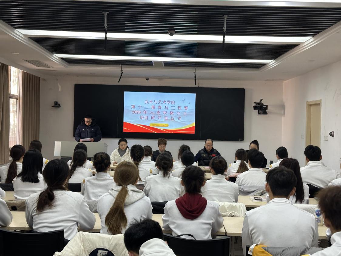 为深入学习贯彻党的二十届四中全会精神,扎实推进青年思想政治引领工作,11月26日中午,武术与艺术学院在图书馆第二报告厅举办第十二期“青年马克思主义者培养工程”暨入党积极分子培训开班仪式。武术与艺术学院党总支书记叶瑛、副书记杜家俊、组织员方媛、学生工作办公室主任常青、辅导员陆丹以及本期培训班全体学员参加。开班仪式由常青主持。