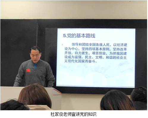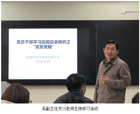 根据校党委的统一部署,为了进一步深入学习党的十九大精神和党的基础理论知识。4月24日中午,民族体育与表演系全体教职工和学生党员在教学楼举行党员干部学习应知应会知识之“党章党规”活动。本次学习活动由民族体育与表演系副主任支川主持,党总支委员杜家俊老师带领全体教师和学生党员进行学习。