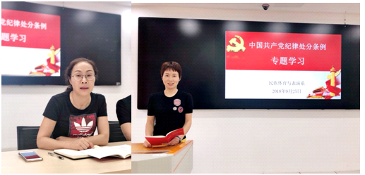 9月25日下午2:30,民表系党总支在图书馆第二报告厅举行党内纪律处分条例学习讨论活动,民表系党总支书记吴晓红、副书记叶瑛、副主任支川及全体党员出席了学习讨论会。