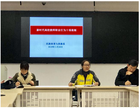 2018年11月20日13:30,民族体育与表演系在图书馆第二报告厅召开全体教师大会,组织学习了新时代高校教师职业行为十项准则,我系全体教师参加了会议。