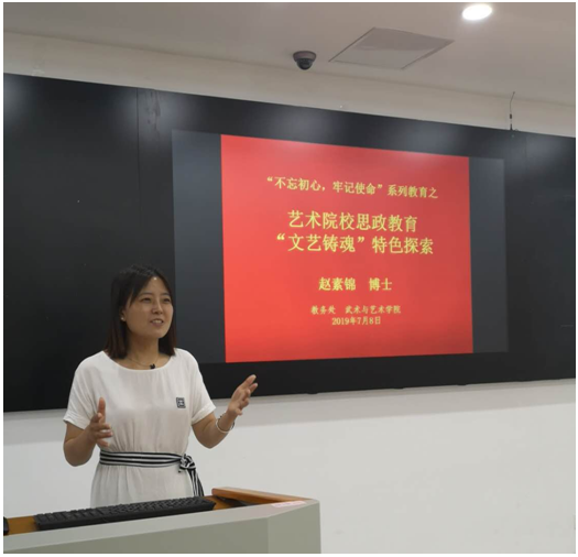 在活动中,南京艺术学院马克思主义学院副院长赵素锦博士应邀做《艺术院校思政教育“文艺铸魂”特色探索》专题讲座。赵博士不仅和大家一起回顾了习近平总书记的“文艺”和“思政”情怀,她还和大家分享了南京艺术学院思政教育的特色探索。赵博士在讲座中详细介绍了南京艺术学院在坚持马克思主义理论、中华优秀传统文化、西方文哲思想和艺术院校专业特色“四位一体”总原则的前提下,通过“大思政”实践教学、“小课”教学实践和学生自主实践活动,实现以“艺”扬“道”、“道”入“艺”心和“艺”“道”合一的目标的主要做法。最后,赵博士从科学理解“中国特色社会主义文化”、三种文化形态的创造性转化和把握时代良机彰显自身特色等维度,和大家分享了她对当代中国文艺发展的思考。
