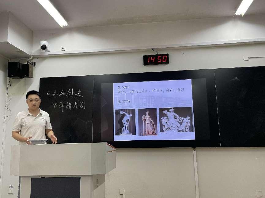 尹超老师是我校新招聘的高层次人才,艺术学博士。尹老师进行了《中外戏剧史》中《古希腊戏剧史》篇章的模拟授课。邵媛和张凌峰两位转岗教师分别进行了《芭蕾基训》之五位转体和《体操》之侧手翻的说课。三位教师均进行了认真准备,展示了自身的专业特长。