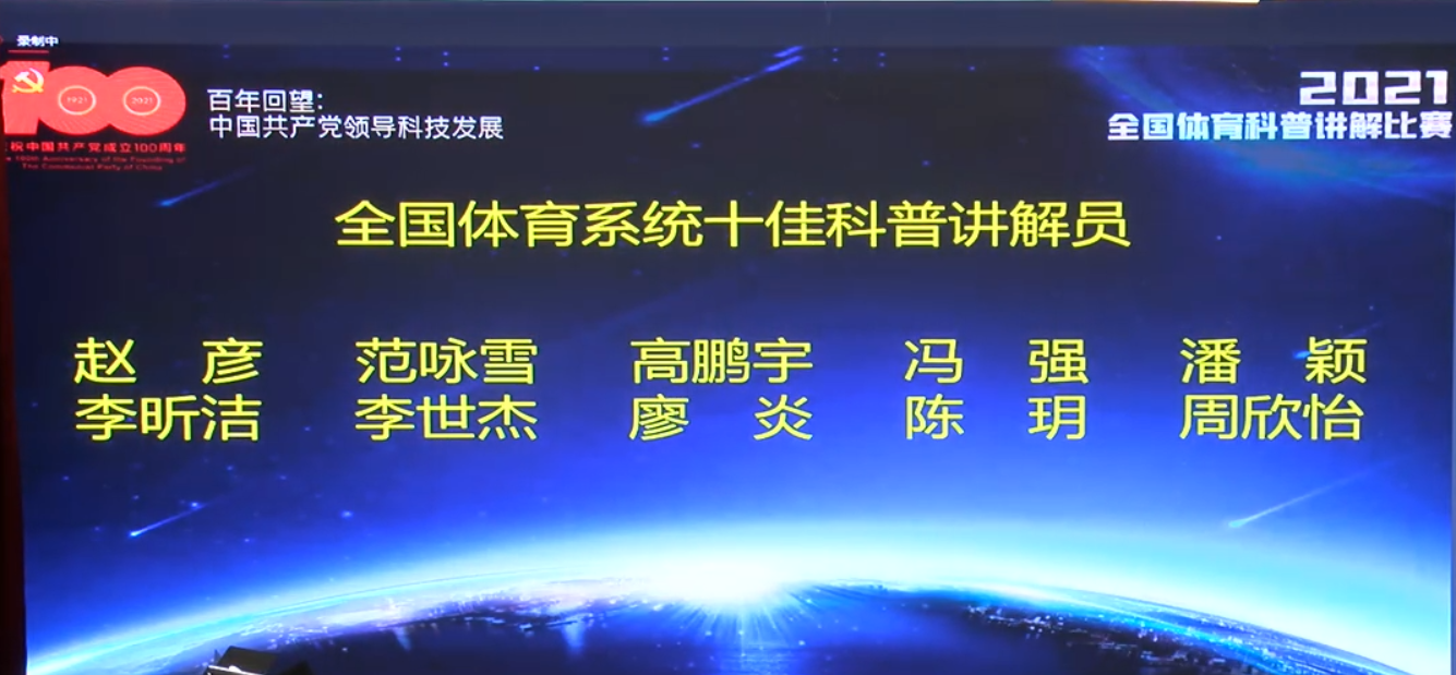 根据《体育总局办公厅关于举办2021年全国体育科普讲解比赛的通知》(体科字[2021]141号)有关要求,我校广泛动员、积极谋划,统筹资源大力支持参赛选手的比赛筹备工作。经过激烈的比赛角逐,我校三名推荐选手凭借过硬的实力、丰富的知识和专业的讲解,全部斩获荣誉。