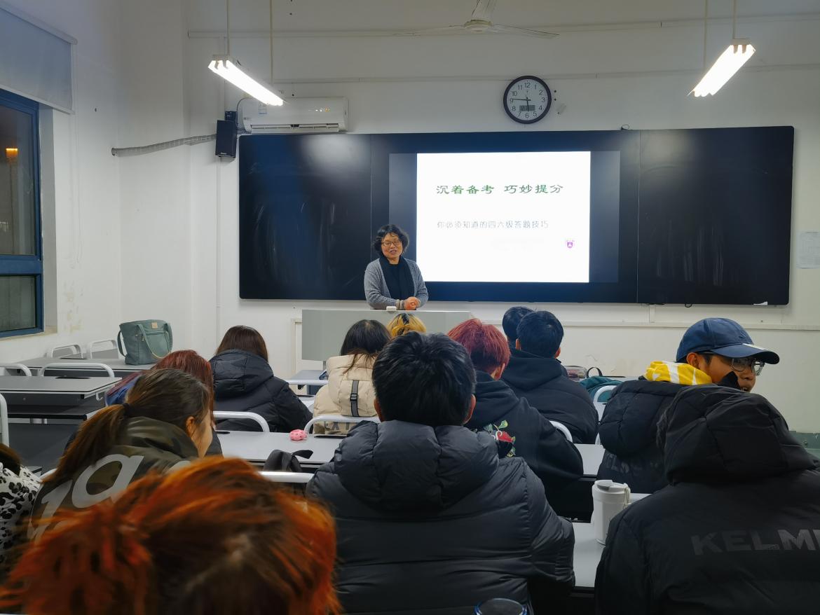 为帮助学生熟悉四六级考试基本流程,了解考试技巧和注意事项,促进提高考试成绩,2023年12月14日,学院邀请南京大学王晓红副教授在仙林教学楼举办《沉着备考·巧妙提分——你必须知道的四六级答题技巧》讲座,卓越班全体学生及部分运动训练专业学生参加了培训。