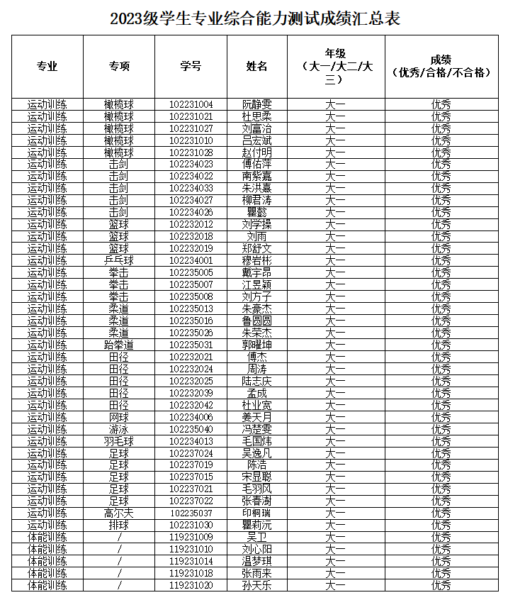 附:2024年运动训练学院2023级学生专业综合能力测试获评优秀学生名单