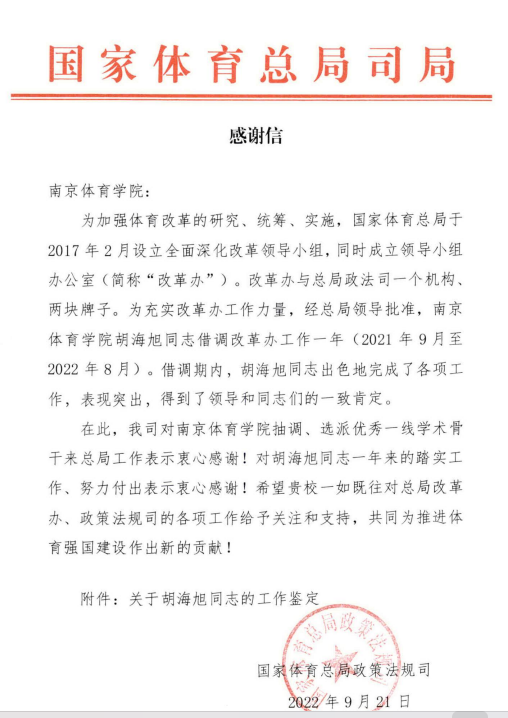 胡海旭老师的学术追求不仅局限于教学,他还积极响应国家体育政策的发展需求,投身于体育科学的前沿研究。过去三年中,他主持或参与了国家体育总局多个决策咨询项目,发表了数篇高质量的科研论文。2021年9月至2022年8月,胡老师更是被借调至国家体育总局政法司,参与全国体育工作改革的研究,其专业知识和研究成果得到了高度认可。他以自身在运动训练理论与方法研究领域的深厚积累,指导学生面对学术和实践中的挑战,培养他们求真务实、脚踏实地的科研精神。