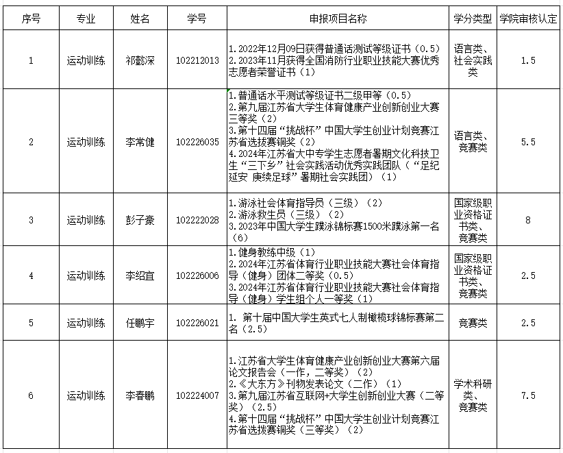 为更好满足我校学生奖励学分使用需求,切实做好我校人才培养服务工作,根据《taptap国际服账号注册本科生奖励学分实施管理办法》(校教发〔2020〕43号)(附件1)的相关要求,运动训练学院对符合申报奖励学分条件的学生进行认定工作,现公示如下: