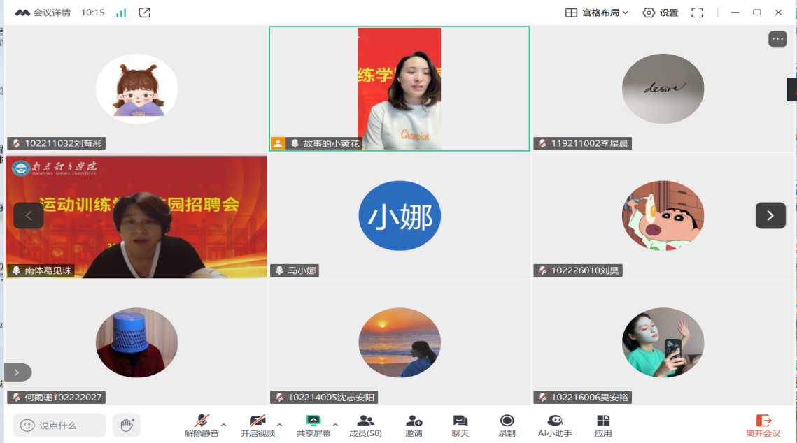2025年6月10日晚上,运动训练学院精心组织的线上校园招聘会顺利开展,邀请南京银城体育有限公司、南京冠枫体育有限公司等多家体育行业提供岗位宣讲,助力2025届毕业生拓宽就业渠道,搭建就业平台,推动体育人才精准对接市场需求。此次招聘会由2021级辅导员吴海艳主持。