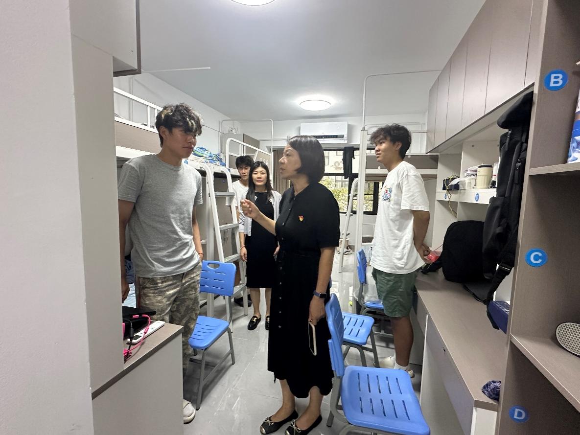 新生入住阶段,志愿者全程陪同至宿舍,协助完成入住登记、物品整理等事宜,保障新生顺利安顿。当日,学院党总支书记葛见珠、党总支副书记沈灵知、组织员吴海艳及2025级新生辅导员黄洪专程前往新生宿舍,与新生及家长面对面交流他们关切询问新生对住宿环境适应情况、生活需求满足情况,用亲切的话语与细致的关怀,让新生在入校首日便感受到学院的重视与关爱。