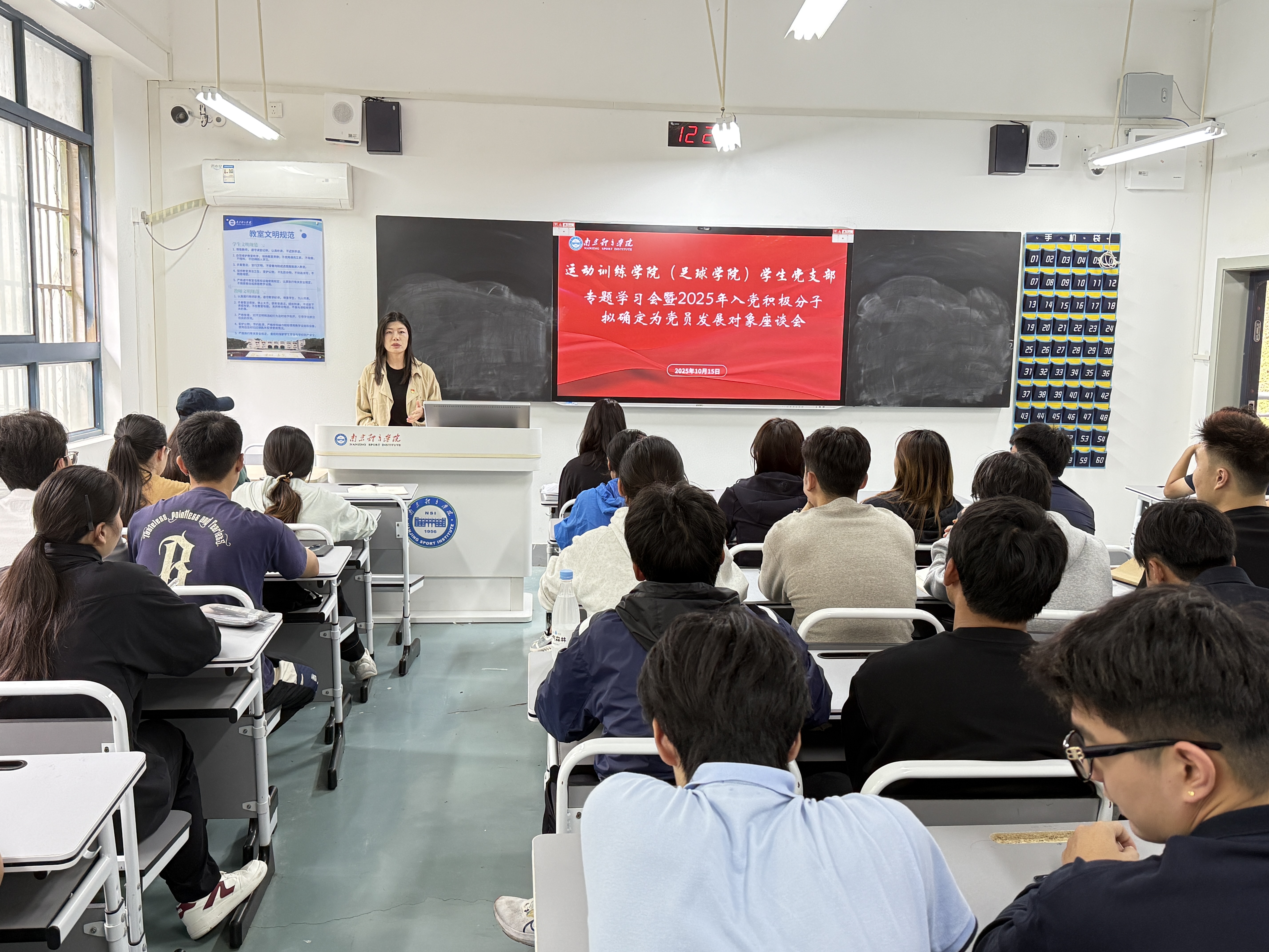 10月15日中午,运动训练学院(足球学院)学生党支部在仙林校区A101教室召开专题学习会暨2025年入党积极分子拟确定为党员发展对象座谈会。会议由学院党总支副书记沈灵知主持,学生党支部成员及入党积极分子参会。