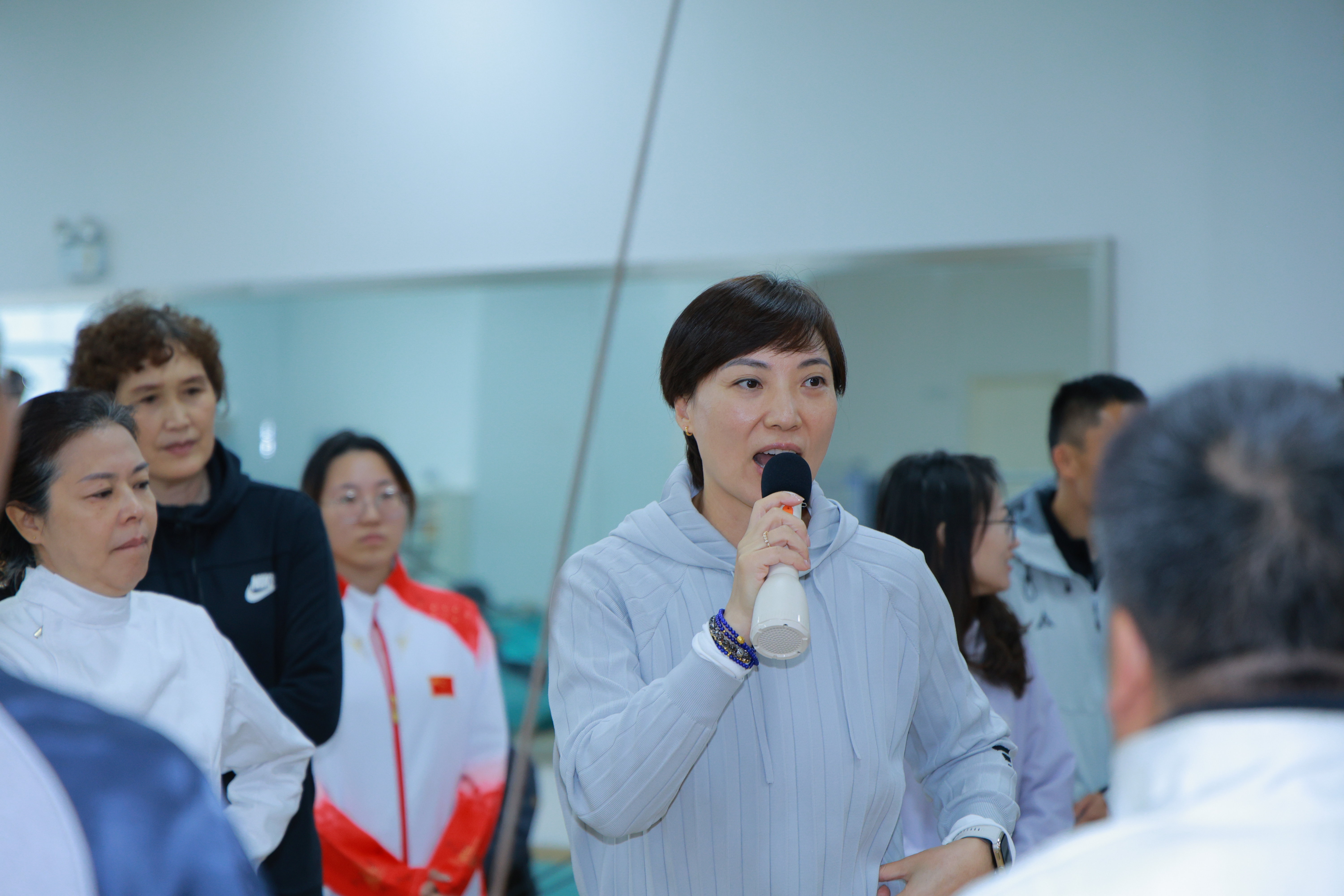 活动伊始,击剑专项教师杜韫洁向到场的各位老师介绍了击剑的起源发展、不同剑种的特点,用生动的讲解为老师们打开击剑文化的大门。随后进入服装体验环节,在击剑专项学生的耐心指导下,老师们逐一穿戴击剑服、面罩与手套,亲手触摸专业装备,直观感受这项运动的严谨与专业。