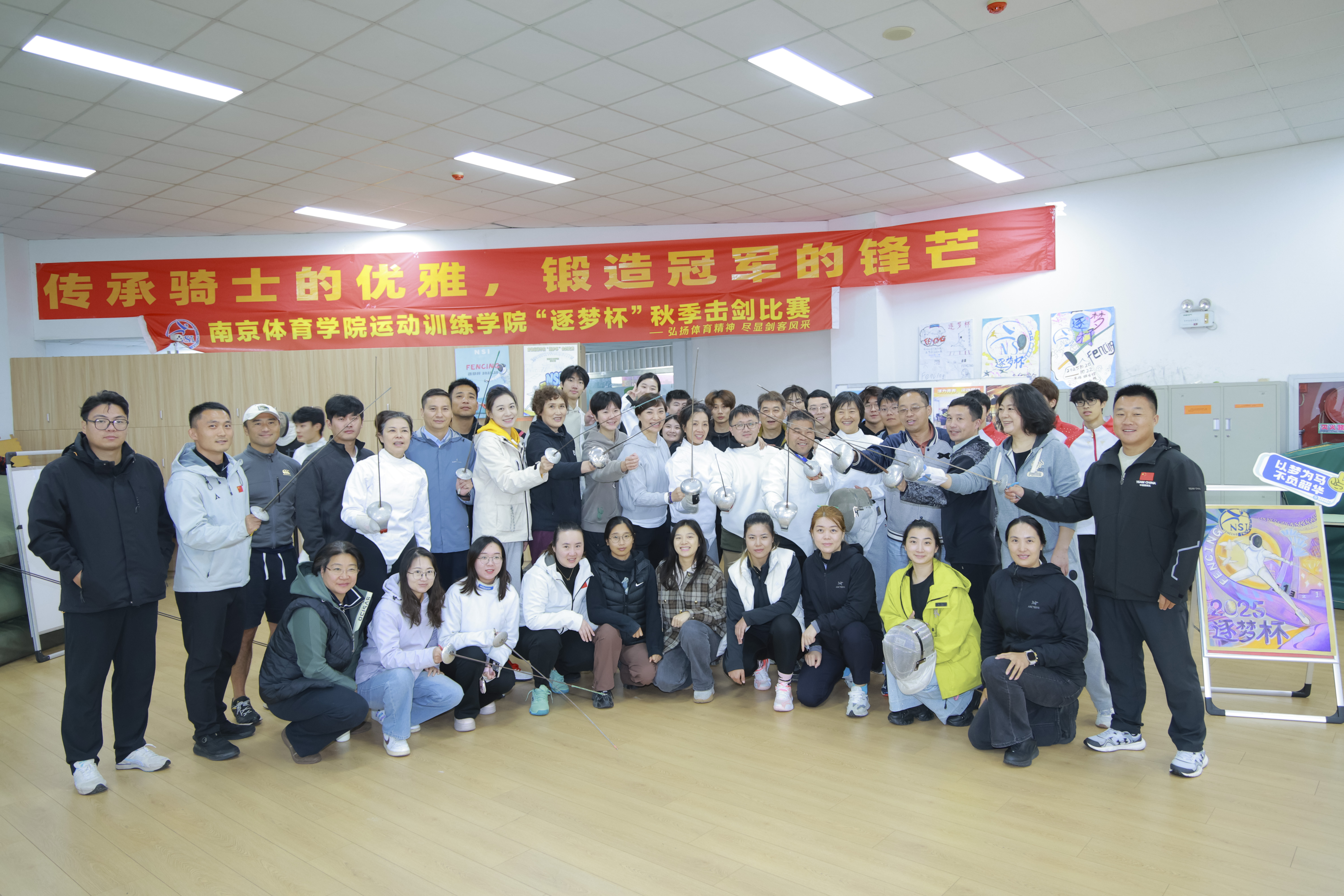 最受期待的刺靶体验环节中,由击剑专项学生先进行基础动作示范,细致讲解出剑角度、发力技巧与安全规范。老师们分组上阵,现场纠错与指导下,从生疏到熟练,一步步掌握刺靶要领,场馆内不时响起阵阵交流与喝彩声。活动最后,全体教师集体合影,定格下这段充满活力的体验时光。