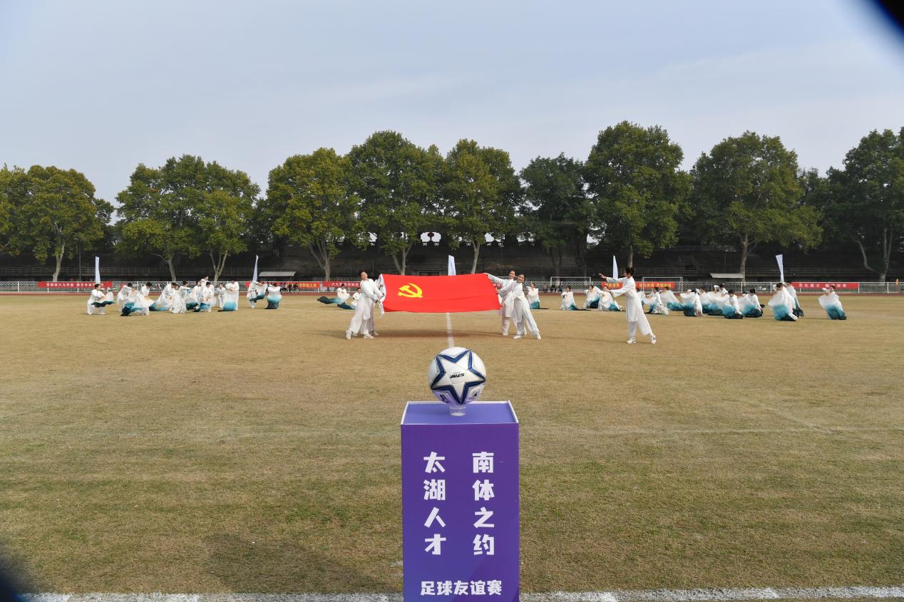 开幕式上,武术与艺术学院大学生表演队以青春舞姿展现体育风采,赢得阵阵掌声。随后,无锡“太湖人才”足球队与南京体院足球队的运动员们精神抖擞、列队入场,整齐的步伐彰显着拼搏之志。在庄严的国歌声中,全体人员肃立致敬,爱国情怀与体育精神在绿茵场上交融升华。仪式现场,双方队员交换队旗,握手致意,传递着“友谊第一、比赛第二”的体育风尚,镜头定格下这一凝聚情谊的珍贵瞬间。
