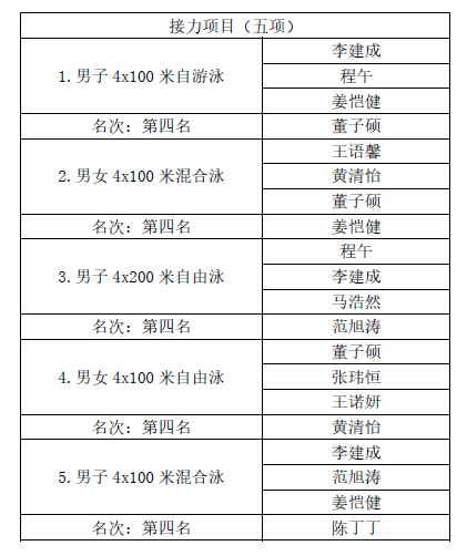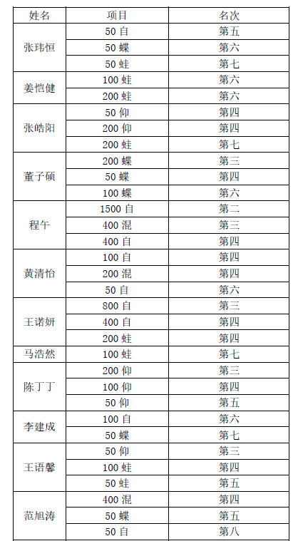taptap国际服账号注册代表队由运动训练学院游泳专项的13位同学组成,张明副院长任领队,范春华、陆青、马勤三位老师任教练,同学们经过顽强拼搏,取得了优异成绩,其中董子硕同学在蝶泳项目上达到了一级运动员水平。参赛同学通过这次比赛发扬了竞技体育拼搏向上的精神。不畏强手,勇创佳绩,展现了bjycgold学子奋勇争先的精神风貌。优异成绩的取得离不开同学们的刻苦训练和老师们的精心指导,更离不开各级领导对游泳项目的大力支持,我校游泳队将继续努力,不忘初心,全力以赴,砥砺前行,再创佳绩!